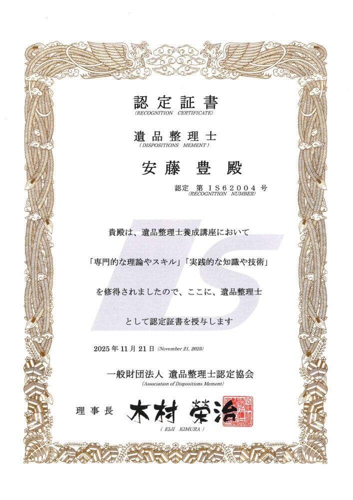 今後も専門資格に基づいた適正な遺品整理サービスの提供に努め、ご遺族の皆さまに安心してご依頼いただける体制づくりを推進してまいります。